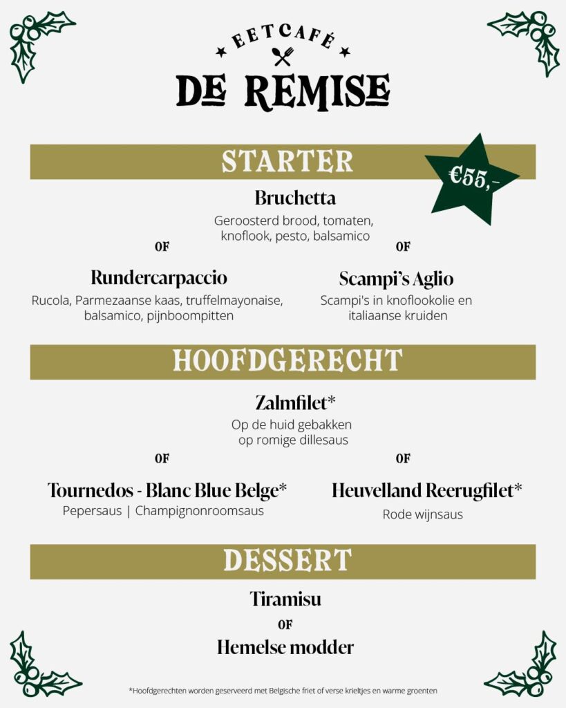 Wil je zeker zijn van een tafel met Kerst? Reserveer dan tijdig jouw favoriete tijdsblok. We nemen ongeveer twee weken vooraf contact met je op om het menu en de keuzes rustig samen door te nemen.